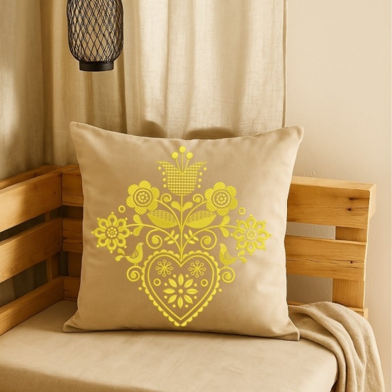 Wzór pełen kwiatów, ptaków i serca oddaje ducha dawnego rzemiosła, a intensywny kolor przyciąga wzrok i wprowadza do wnętrza promienną atmosferę.